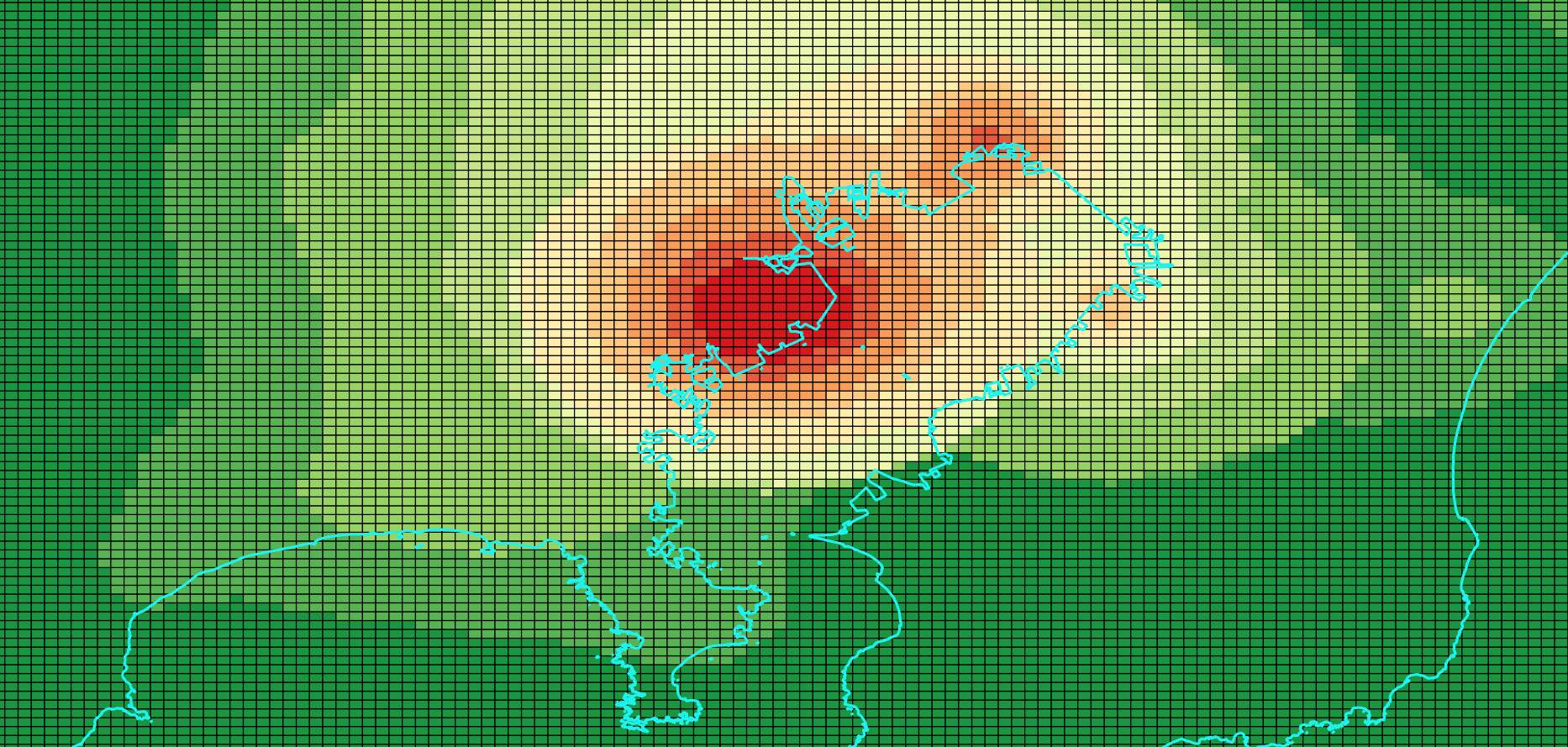 メッシュごとの排出量からサンプルプログラムによる計算のイメージ(3次メッシュ)