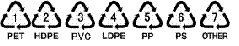 資源有効利用促進法に基づいてプラスチック製品に表示されているプラスチックの識別マークです。ペットボトルには、1のポリエチレンテレフタレート(PET)マークを表示するように義務づけられていますが、ペットボトル以外のプラスチック製品への表示は任意表示となっています。