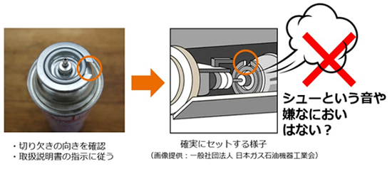 カセットボンベ等を機器に装着する場合は、取扱説明書の指示に従って確実に装着しましょう。カセットボンベ等の装着を誤った状態で使用すると、ガス漏れが生じて火災に至るおそれがあります。
