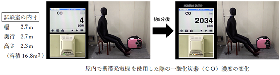 四畳半相当の締め切った部屋で小型汎用エンジンの携帯発電機を使用した場合、8分後には、室内の一酸化炭素濃度は2000ppmを超えました。(上の写真:検証例)