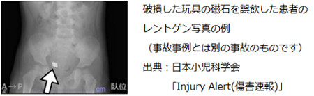 →おもちゃ(※2)の樹脂ケースが破損し、内部の円柱形のネオジム磁石が脱落して、こどもが誤飲したものと考えられます。