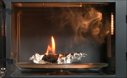 レンジ加熱して発火(再現実験) 可燃物が発火(再現実験)