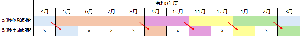 なお、試験実施月の前月末までに、試験依頼書及び試験結果交付申請書が受け付けられ手数料の入金が確認された依頼については、試験実施月に試験を実施いたします。試験依頼書と試験結果交付申請書の受付から請求書の発行まで5営業日ほどかかりますので、ご留意ください。