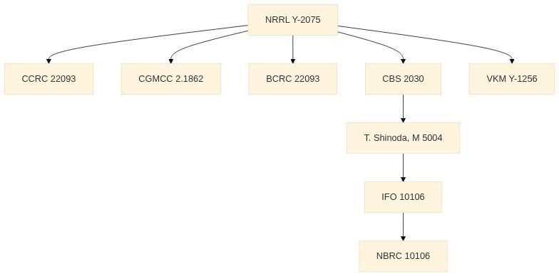 来歴 | IFO 10106 <- T. Shinoda, M 5004 <- CBS 2030 <- NRRL Y-2075 (L.J. Wickerham) |