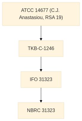 来歴 | IFO 31323 <- TKB-C-1246 <- ATCC 14677 (C.J. Anastasiou, RSA 19) |