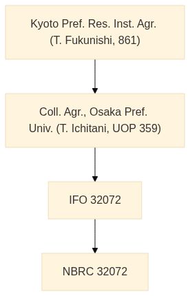 他機関での菌株情報 | IFO 32072 <- Coll. Agr., Osaka Pref. Univ. (T. Ichitani, UOP 359) <- Kyoto Pref. Res. Inst. Agr. (T. Fukunishi, 861) |
