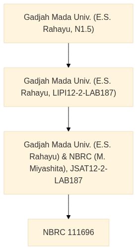 来歴 | Gadjah Mada Univ. (E.S. Rahayu) & NBRC (M. Miyashita), JSAT12-2-LAB187 <- Gadjah Mada Univ. (E.S. Rahayu, LIPI12-2-LAB187) <- Gadjah Mada Univ. (E.S. Rahayu, N1.5) |